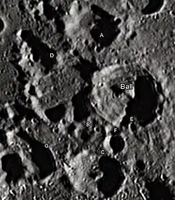 De kratere, som kaldes satellitter, er små kratere beliggende i eller nær hovedkrateret. Deres dannelse er sædvanligvis sket uafhængigt af dette, men de får samme navn som hovedkrateret med tilføjelse af et stort bogstav. På kort over Månen er det en konvention at identificere dem ved at placere dette bogstav på den side af satellitkraterets midte, som ligger nærmest hovedkrateret.[9][10][11] Ballkrateret har følgende satellitkratere: