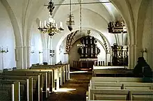 Kirken fik hvælv i 1494, ifølge datering i koret. Dette er formodentlig sket i forbindelse med udvidelse mod vest og opførelse af et tårn. Altertavlen stammer fra omkring 1600, korsfæstelsen er udført af Gunnar Hansen i 1957. Kirkens oprindelige stenalter er bevaret og kan ses bag det nuværende egetræsbord. Prædikestolen er fra omkring 1650, på himlen ses våben for Mogens Høeg og Christense Rosenkrantz.