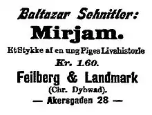 - Mirjam. Et Stykke af en ung Piges Livshistorie. Feilberg & Landmark (Chr. Dybwad). Christiania, 1896. 120 s.