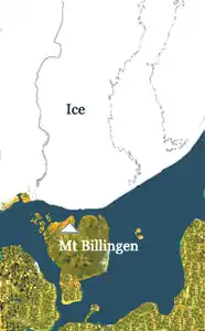 Den sene baltiske issø omkring år 10.300 f.v.t., men en kanel nær Billingen igennem det centrale svenske lavland. (politiske grænser er tilføjet)