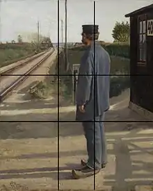 Beskæringen er usædvanlig, idet venstre billedkant overskærer skinnerne og skyggerne fra banevogteren og ledvogterhuset. Øverst skæres telegraftrådene og telegrafpælen over. I højre side skæres hytten over, så man ikke kan se hjørnet, og hyttens nummer er malet helt ude ved kanten.
