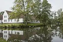 Den stråtækte højremslade med bindingsværk er fra 1580'erne. Bygningerne er omgivet af middelalderlige voldgrave.
