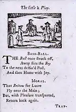 Udviklingen af den separate sport baseball ud fra diverse bat-og-bold-spil er svær at spore præcist. Det er almindeligt accepteret, at moderne baseball er en nordamerikansk videreudvikling af det ældre spil "rounders" (en mellemting mellem rundbold og moderne baseball), omend visse historikere argumenterer imod denne påstand.[1] Adskillige henvisninger til "baseball" og "bat-and-ball" er blevet fundet i engelske og amerikanske dokumenter fra starten af det 18. århundrede.[2] Den tidligst kendte beskrivelse af sporten stammer fra en britisk udgivelse fra 1744, A Pretty Little Pocket-Book af John Newbery. Den indeholder træsnitsillustrationer af drenge, der spiller "base-ball", og viser en bane nogenlunde identisk med den moderne. Illustrationerne var suppleret med en beskrivelse af sporten på rimede vers. Den tidligst kendte utvetydige amerikanske diskussion af "baseball" er en lov fra 1791 i Pittsfield, Massachusetts, der forbyder udøvelse af baseball inden for en radius af 80 yards fra byens nye mødehus.[2] Den engelske romanforfatter Jane Austen inkluderede en henvisning til børn, som spiller "base-ball" i en landsbygrønning, i hendes bog Northanger Abbery, der blev skrevet mellem 1798 og 1803 (men først udgivet i 1818).