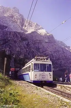 Ved stationen i Eibsee, bemærk tandstangen imellem sporene, juni 2010