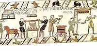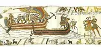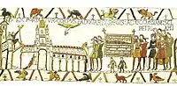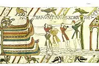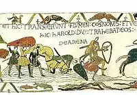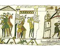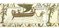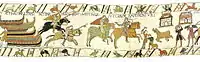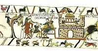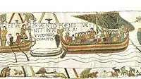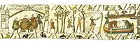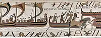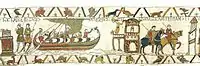 | 38. | HIC WILLELM[US] DUX IN MAGNO NAVIGIO MARE TRANSIVIT ET VENIT AD PEVENESAE | Her krydser hertug Vilhelm havet i et stort skib og kommer til Pevensey[17] | |