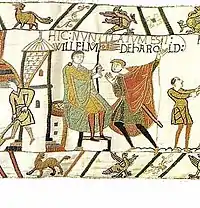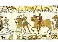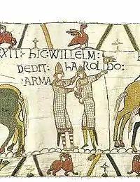 | 21. | HIC WILLELM[US] DEDIT ARMA HAROLDO | Her giver Vilhelm Harald våben | ![]() |