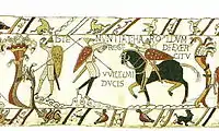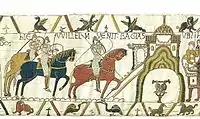 | 13. | HIC WIDO ADDUXIT HAROLDUM AD WILGELMUM NORMANNORUM DUCEM | Guy fører Harald til normannernes hertug, Vilhelm | ![]() |