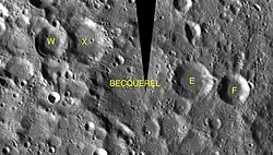 De kratere, som kaldes satellitter, er små kratere beliggende i eller nær hovedkrateret. Deres dannelse er sædvanligvis sket uafhængigt af dette, men de får samme navn som hovedkrateret med tilføjelse af et stort bogstav. På kort over Månen er det en konvention at identificere dem ved at placere dette bogstav på den side af satellitkraterets midte, som ligger nærmest hovedkrateret.[10][11][12] Becquerelkrateret har følgende satellitkratere: