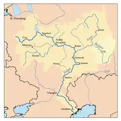 | Kort over Volgas afvandingsområde med Belajas afvandingsområde til højre. | |