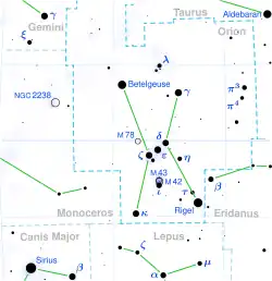 | Bellatrix findes opad til højre fra centrum (γ). | |