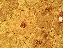 Tværsnit af benvæv (kompakt ben), forstørret ca. 100 gange.