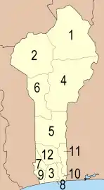 Benin er inddelt i 12 departementer, som igen er inddelt i 77 kommuner. Departementet Littoral består af kun en kommune, Cotonou, som er landets reelle hovedstad, mens Porto-Novo er den officielle hovedstad.