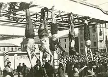 I april 1945 forsøgte Mussolini at flygte til Schweiz, men blev pågrebet og skudt af italienske partisaner i nærheden af Comosøen. Derefter blev liget fragtet til pladsen Piazzale Loreto hvor han, sammen med blandt andre elskerinden Claretta Petacci og en gruppe anholdte fascister, hængtes med hovedet nedad fra tagkonstruktionen på en benzinstation.