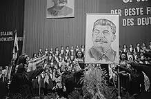 Udviklingen af personkulten omkring Stalin begyndte allerede i slutningen af 1930'erne, men blev marginaliseret under Anden Verdenskrig. For at mobilisere befolkningen mod fjenden fokuserede sovjetiske film under og umiddelbart efter krigen på historiske helte, der forsvarede Rusland, eller på folkets bedrifter.[4] Stalin var alene en karakter i to film under krigen.[5] Men da sejren syntes sikker, strammede Stalin sit greb over alle aspekter af det sovjetiske samfund, herunder også om filmindustrien. Efter 1945 vendte kultdyrkelsen tilbage til sovjetisk film med større intensitet end nogensinde før, og han blev krediteret som den eneste arkitekt bag Tysklands nederlag. Denise J. Youngblood skrev, at der kort efter krigsafslutningen kun var tre slags krigshelte tilbage: "de døde, de lemlæstede og Stalin."[4]