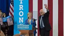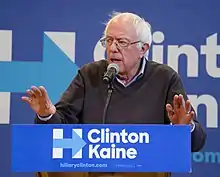 Elizabeth Warren var åbensindet overfor Sanders' præsidentkampagne. "Jeg er glad for at se ham komme derud og præsentere hans version af, hvad [han mener], lederskab i dette land skal være" sagde hun under et møde med college-studerende i Massachusetts i maj 2015.[lower-alpha 16][126][127] Mange havde regnet med, at Warren officielt ville støtte Sanders til præsidentposten, men i stedet valgte hun at støtte Sanders' modkandidat, den tidligere udenrigsminister og vinder af Demokraternes kandidatnominering til præsidentvalget, Hillary Clinton.[128][129][130]
