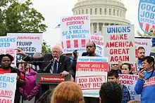 I juli 2015 introducerede Sanders et lovforslag, der skulle hæve den føderale minimumsløn til fra 7,25 til 15 dollar i timen.[111] I april 2017 introducerede han igen et lignende lovforslag om at hæve lønnen til 15 dollar i timen - en forhøjelse i forhold til et tidligere Demokratisk lovforslag, der lød på 12 dollar i timen.[112] Den 9. maj 2018 introducerede han the Workplace Democracy Act; et lovforslag der ville udbygge arbejderes rettigheder ved at gøre det nemmere for arbejdere at melde sig ind i en fagforening, forbyde "ret til at arbejde"-love og visse anti-fagforeningslove i Taft-Hartley-loven samt forbyde visse former for anti-fagforeningsaktivitet. Under annonceringen af lovforslaget sagde Sanders: "Hvis vi er seriøse omkring at reducere indkomst- og formueuligheden og om at genopbygge middelklassen, har vi brug for væsentligt at forhøje antallet af fagforeningsjobs i dette land."[lower-alpha 11][113]