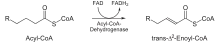 - Enzymet Acyl-CoA dehydrogenase katalyserer oxidationen af carbonatomerne β og γ ved samtidig reduktion af elektrontransporteren FAD til FADH2. Electron transfer flavoprotein (ETF) fragter FADH2 til elektrontransportkæden - som også befinder sig i mitokondriet - hvor FADH2 reoxideres til FAD. Carbonatomerne β og γ er nu forbundet med en dobbeltbinding og hele fedtsyreforbindelsen hedder Δ2-trans-Enoyl-CoA.