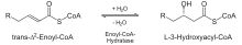 Trin 2 - Enzymet Δ2-trans-Enoyl-CoA hydratase adderer vand over dobbeltbindingen mellem β og γ. γ har nu en hydroxylgruppe (-OH) tilknyttet. Δ2-trans-Enoyl-CoA er blevet til L-3-hydroxyacyl-CoA.