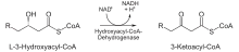 - Enzymet L-3-hydroxyacyl-CoA dehydrogenase katalyserer endnu en oxidation. Denne gang reduceres elektrontransporteren NAD+ til NADH + H+. Hydrogenatomerne kommer fra fedtsyrens carbonatom γ og den tilknyttede hydroxygruppe. Reaktion er en eliminationsreaktion og fører til at hydroxylgruppen på γ erstattes med en oxogruppe. NADH + H kan reoxideres til NAD+ i elektrontransportkæden. L-3-hydroxyacyl-CoA skifter navn til 3-ketoacyl-CoA.