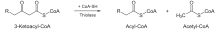 Trin 3 - Enzymet thiolase spalter 3-ketoacyl-CoA i to dele. Den ene del er acyl-CoA (men en kortere udgave end den i trin 1), mens det andet produkt får påsat forbindelsen CoA-SH og bliver til acetyl-CoA.