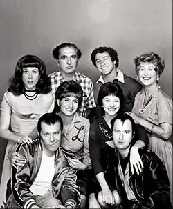 ![]() Betty Garrett i 1976 yderst til højre, med andre medvirkende fra Laverne & Shirley. | |