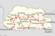 Transportmulighederne er påvirket af landets høje og stejle dalføre. Mange bygder har lille eller ingen vejforbindelse, og halvdelen af indbyggerne har en halv dags gange til bilvej. Den første vej i Bhutan blev bygget i 1962, med indisk bistand. Den går fra Phuentsholing ved den indiske grænse, til Paro og Thimpu og derfra østover i landet. Landet har ca. 8.000 km veje, heraf er 3.750 km hovedveje. 62% er asfalterede. Vejene er vanskelige at vedligeholde og generelt i dårlig stand.[36] Landet har ca. 24.000 biler. (2001) Det er godt organiserede, men ofte overfyldte, busruter.