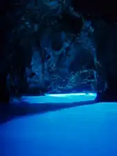 På den bratte kyst er det flere grotter, den mest kendte kaldes den blå grotte (kroatisk: Modra špilja). Den har vært tilgængelig siden 1884, men kan kun nås med båd.[4] Den er 18 meter lang, 6 meter dyb og 6 meter høj.[3] Grotteindgangen er kun 1,5 meter høj og 2,5 meter bred.[6] Mellem klokken 10 og 13 reflekteres solstråler som trænger gennem den undersøiske åbning i den hvide bund, og giver grotten en blå farve og fisk og andre objekter i vandet en sølvfarve.[4]