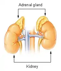 Illustration af binyrerne hos mennesket og deres placering i forhold til nyrerne.