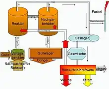 På et biogasanlæg (58 styk i Danmark i 2023)[1][2][3] modtager man biomasse i form af husdyrgødning og planteaffald fra landbrug, og organiske produkter fra slagterier, mejerier, industri, husholdninger mfl.[4] Biomassen omdannes i en kæmpe tank, hvor bakterierne får optimale vækstbetingelser: