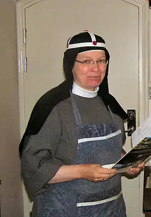 Dragt af gråt vadmel, håret dækket med et hvidt hovedlin og over dette et sort slør holdt fast med en speciel krone. Kronen har fem røde mærker som symbol på Jesu blod. For munke en grå kappe med et rødt kors.