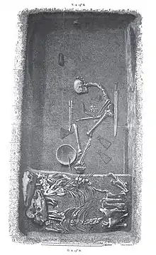Blandt de genstande, som blev fundet i graven, var et sværd, en økse, et spyd, pilespidser, en seax, to skjolde, to stigbøjleer, spillebrikker, en terning og mulige rester fra et spillebræt, samt en hoppe og en hingst.[4] Der blev også fundet rester af noget, som kunne være et spejl.[3]