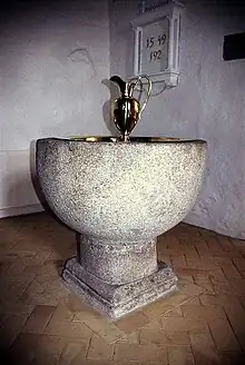 Den romanske døbefont af granit er ganske enkel med glat kumme, rundt skaft og firkantet fod.