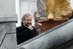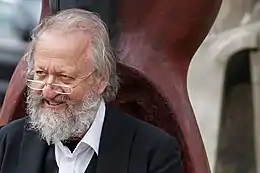 ![]() Bjørn Nørgaard ved skulpturen Menneskemuren (Horsens 2010)  Foto: Hreinn Gudlaugsson  | |