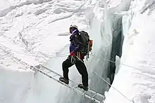 Ved bjergbestigning anvendes altid redskaberne isøkse og steigeisen for at kunne klatre på sikker vis hen over gletsjere og stejle sne og isskråninger.