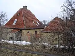 Bygningerne var opr. fuldmurede i røde tegl med helvalmet, opskalket tegltag med høj rejsning og karakteristisk skorsten. Hovedbygningen er kun på 8 m × 10 m. Udhuset, der i banens tid var retirade (toilet) og brændemagasin, er på 4 m × 5 m og proportioneret ligesom hovedbygningen, også med helvalmet rødt tegltag. Med et gårdrum imellem på ligeledes 4 m × 5 m, udgør de to bygninger et harmonisk sluttet lille kompleks, der trods sine få kvadratmeter er "stateligt". Bygningen blev desværre pudset op omkring 1980'erne, så den fremstår uoriginalt, og med malede facader.