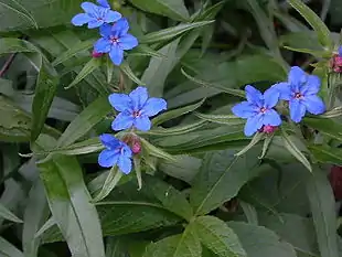 Blomstringen sker i maj-juni, hvor man ser blomsterne sidde samlet i små, endestillede svikler. Blomsterne er 5-tallige og regelmæssige med sammenvoksede kronrør. Kronbladene er først rødviolette, men senere bliver de dybblå. Frugterne er nøddeagtige delfrugter, som er stenhårde
