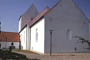 Kor og skib er opført i romansk stil ca. 1150 af frådsten uden synlig sokkel. Tårn er bygget litt senere en koret og våbenhus er opført i sengotisk tid (ca. 1400-1500). Kirken var oprindelig, i katolsk tid, viet til Sankt Laurentius. Kirken er pudset, hvorfor alle oprindelige enkeltheder er skjult. Der finnes en gammel klausul på Korsgården at denne skal levere frådsten til kirken ved restaureringer.