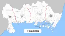 Den sydlige kyst er stærkt gennemskåret og omgivet af en bred skærgård, i særdeleshed ved den østlige del, ud for hvilken findes flere større øer som Hasslö, Aspö, Tjurkö, Sturkö (den største, omkring 16 km2) og Senoren.