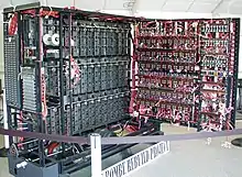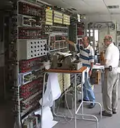 ![]() I 1994 begyndte en gruppe under Tony Sale at rekonstruere en Colossus Mark 2 computer på Bletchley Park. Her, i 2006, overvåger Sale, at en kodet meddelelse bliver afkodet med den færdigbyggede maskine. |