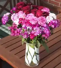 Blomsterbuket med roser og studenternelliker. Det ses, at farverne er kombineret efter princippet tone-i-tone. Derimod er kombinationen af rosernes store hoveder med studenternellikernes små blomsterkroner ret tilfældig og ikke afbalanceret.