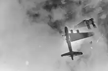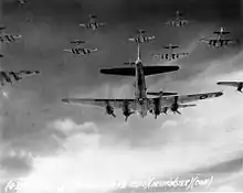 Det andet raid imod Schweinfurt, den 14. oktober 1943, ville senere blive husket under navnet "Den Sorte Torsdag".[96] Angrebet var succesfuldt og klarede at forstyrre produktionen væsentligt under resten af krigen, men det havde store omkostninger.[97] Af de 291 angribende Fæstninger blev 60 skudt ned over Tyskland, yderligere fem styrtede ned på vej tilbage til England, og endnu 12 blev skrottet efter de omfattende skader de havde lidt – i alt et tab på 77 stk. B-17.[98] Derudover var 122 bombefly blevet beskadiget og havde behov for reparationer før de kunne udføre tjeneste igen. Af de 2.900 deltagende besætningsmedlemmer, vendte 650 ikke tilbage, selvom en del af dem overlevede som krigsfanger. Kun 33 bombere landede uden skader. Disse tab var resultatet af koncentrerede angreb af over 300 tyske jagerfly.[99]