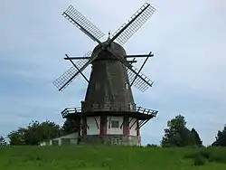 Møllen blev opført af Erich Dan, hvis navn ses over indgangen.