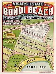 I 1809 fik vejbyggeren William Roberts tildelt land i området.[4][5] I 1851 købte Edward Smith Hall og Francis O'Brien 200 acre (80 hektar) af dette land, og hovedparten af det der lå ned til stranden, som blev kaldt "The Bondi Estate." Hall var O'Briens svigerfar. Mellem 1855 and 1877 købte O'Brien resten af sin svigerfars jord og omdøbte det til "O'Brien Estate". Han åbnede stranden og det omliggende område for offentligheden til picnic og forlystelser. Da stranden blev stadig mere populær, truede O'Brien med at lukke for offentlig adgang til stranden. Efter opfordring fra Waverley Council gjorde regeringen i New South Wales i midten af 1882 Bondi Beach til en offentlig strand.[6] Den første sporvogn til stranden åbnede i 1884. Waverley Council byggede de første badehuse på stranden i 1903. I 1929 besøgte omkring 60.000 mennesker på en sommerdag i weekenden. Åbningen af en pavillion samme år blev besøgt af 200.000.[7]