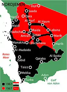 På royalistsiden støttede Jordan og Saudi-Arabien med militærhjælp, og Storbritannien støttede i det skjulte. Republikanerne var støttede af Ægypten og fik kampfly fra Sovjetunionen.[2] Både irregulære og konventionelle fremmede styrker deltog i krigen. Ægyptens præsident Nasser støttede republikanerne med 70.000 ægyptiske styrker og våben. Trods flere militære bevægelser og fredskonferencer blev situationen fastlåst i midten af 1960'erne.