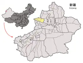 | 2 | Jinghe | 精河县 | Jīnghé Xiàn | جىڭ ناھىيىسى | Jing Nahiyisi | 130.000 | 11.189 | 12 |