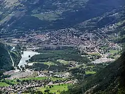 Byen ligger i 829 m.o.h.[1] Byens banegård er endestation for togforbindelse i dalen.[4]