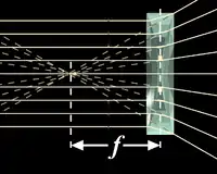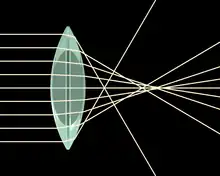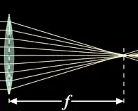 Illustrationen til højre viser hvordan parallelle lysstråler, der kommer ind i billedet fra venstre, bliver afbøjet i en sfærisk samlelinse.