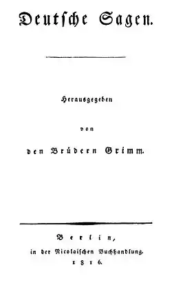 Indscanning af forsiden til første bind af Deutsche Sagen, et værk udgivet fra 1816-18 med 585 tyske legender.