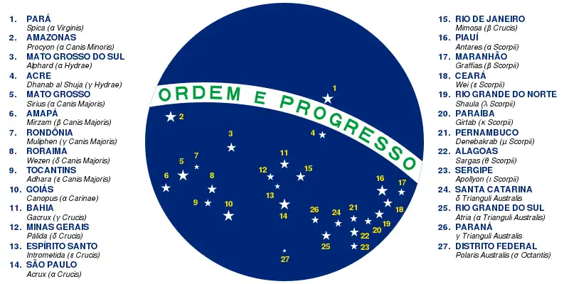 Hver af de 27 stjerner i den blå cirkel repræsenterer en delstat samt det føderale distrikt. Den sidste stjerne repræsenterer også de brasilianske besiddelser. Antallet af stjerner forøges (i princippet – ikke helt i praksis), når der oprettes nye stater (på samme måde som i USA's flag), hvorfor antallet er steget fra 21 til 27 stjerner ved republikkens grundlæggelse.