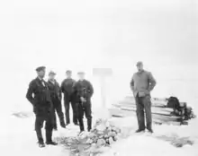 Fem af de syv som gik i land på Victoriaøen den 6. august 1930. Fra venstre: Peder Eliassen, Syver Alvestad, Bjarne Ekornaasvaag, Lars Tusvik og Olaf Hanssen.
